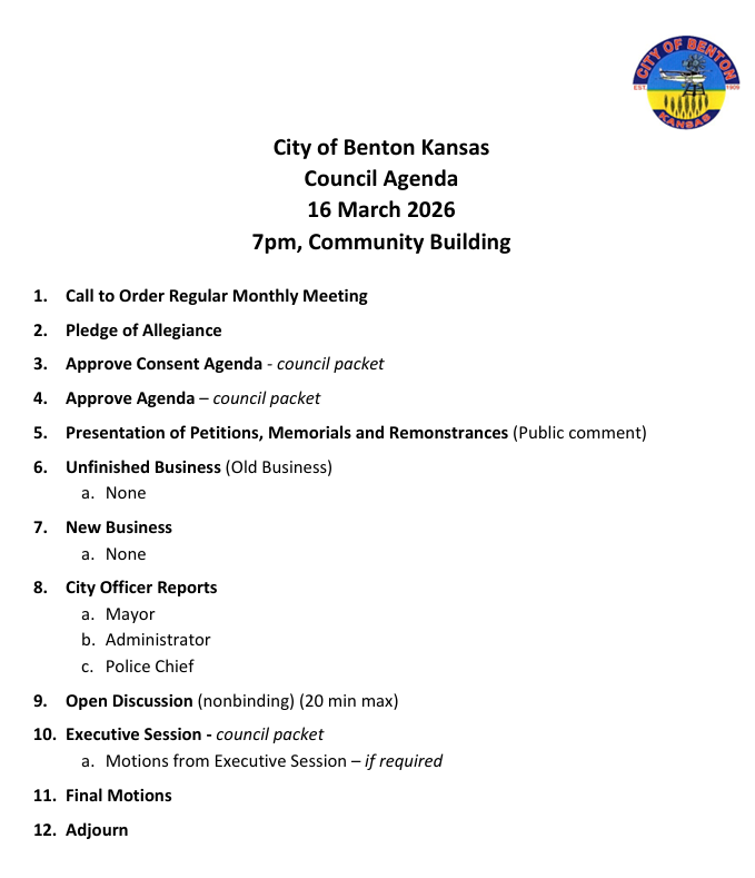The next City Council meeting will be March 16th, 2026 at the Community Building at 7pm.